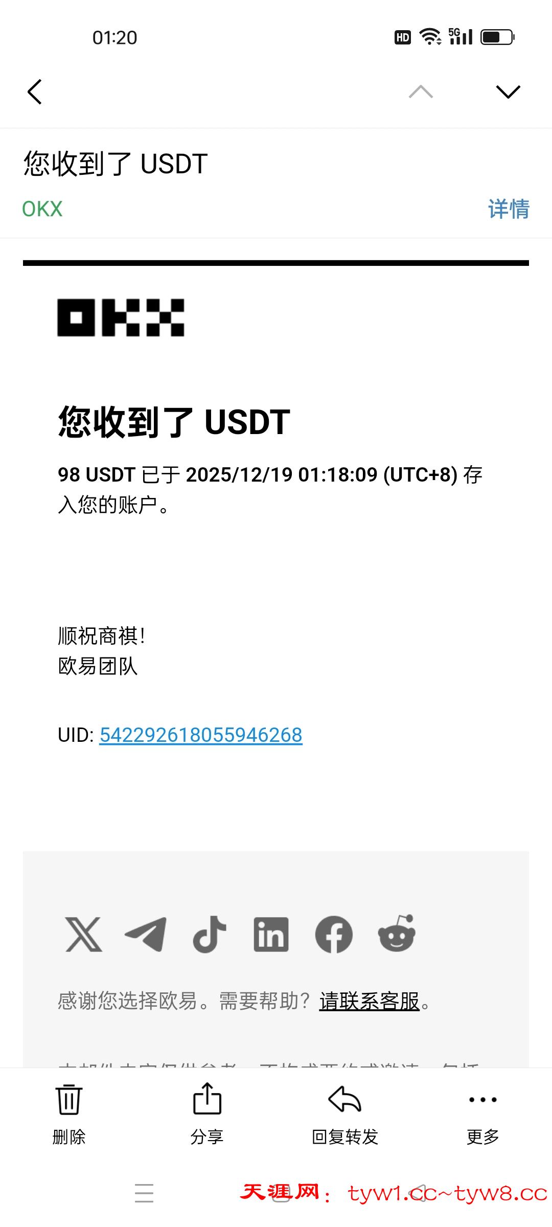 收到了哥,感谢天涯