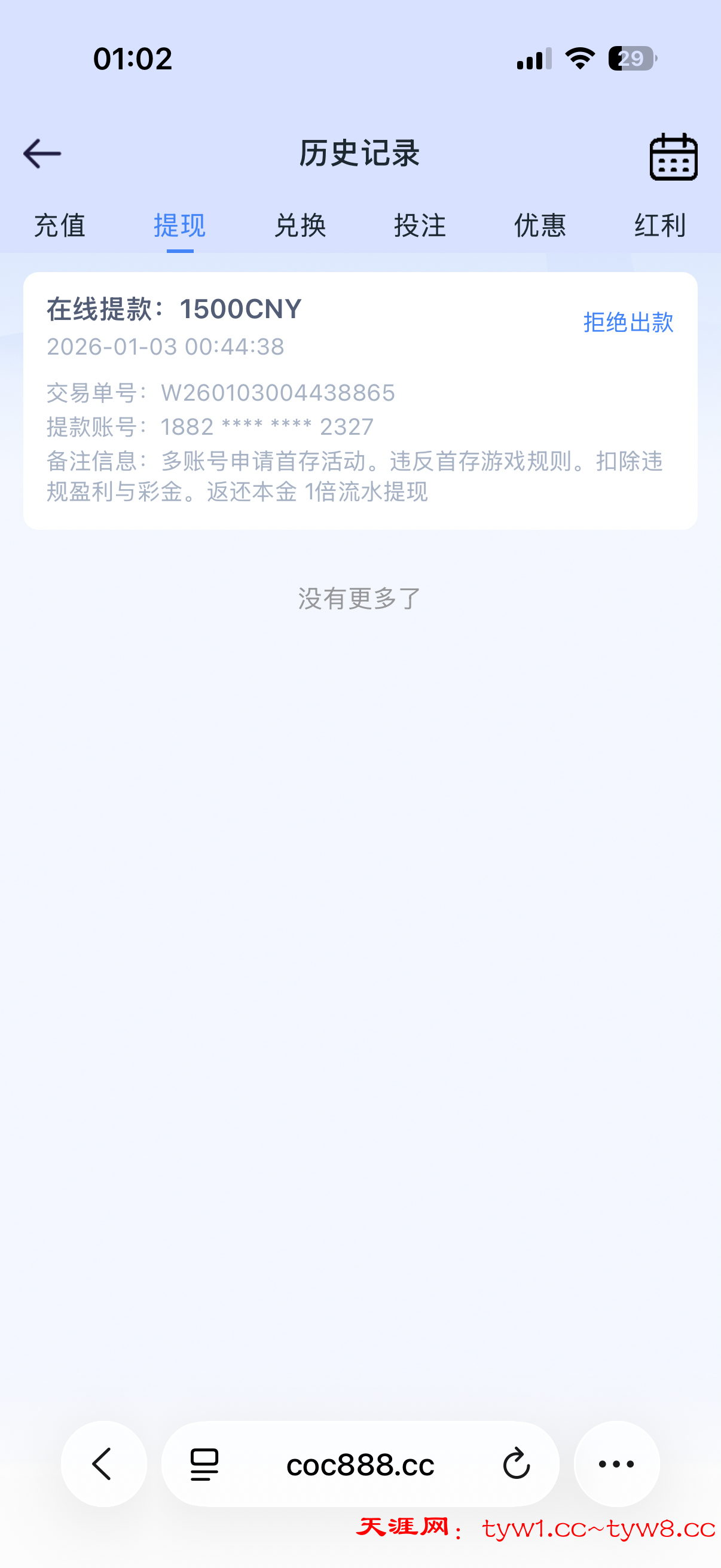 之前在其他论坛注册的一直没有充值过,昨天晚上没有1+1玩了充了100全程打的pg没有违规一直就注册过一个号,客服说我多账号套首存让他拿出我其他账号他又拿不出来,大家还是慎重玩