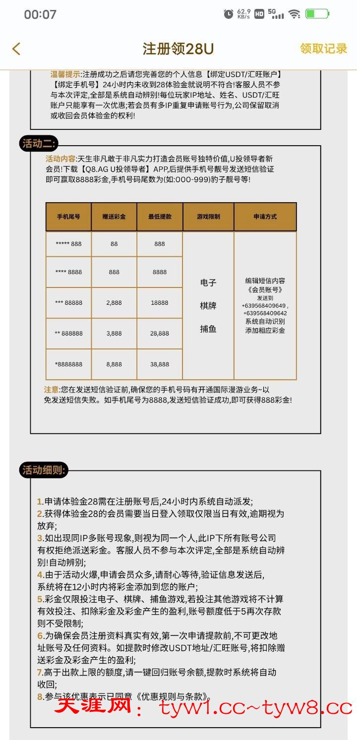 手机尾号三连即可申请88U彩金,发送短信二十分钟左右到账,我已经撸了两个号了