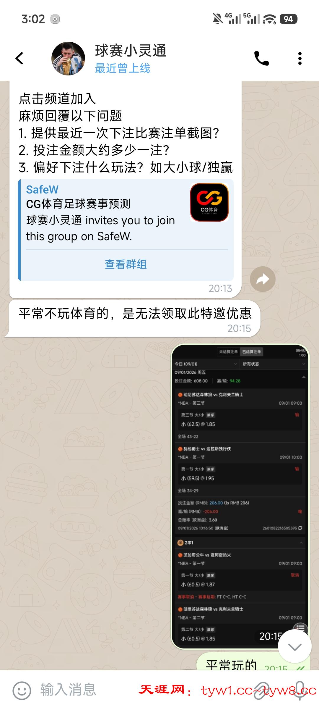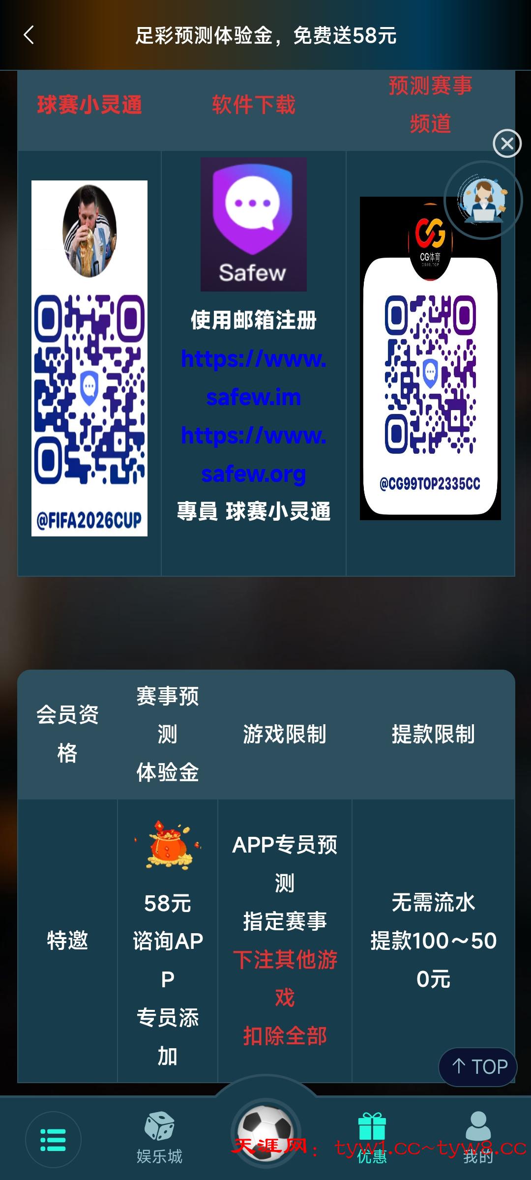 规则改了,特邀领取联系专员58,需要提供近期下注的体育注单,不是CG的也可以,只能打群里的预测赛事,大小球和让球还是可以的,无需流水,100起提,最多500。网址CG99.top