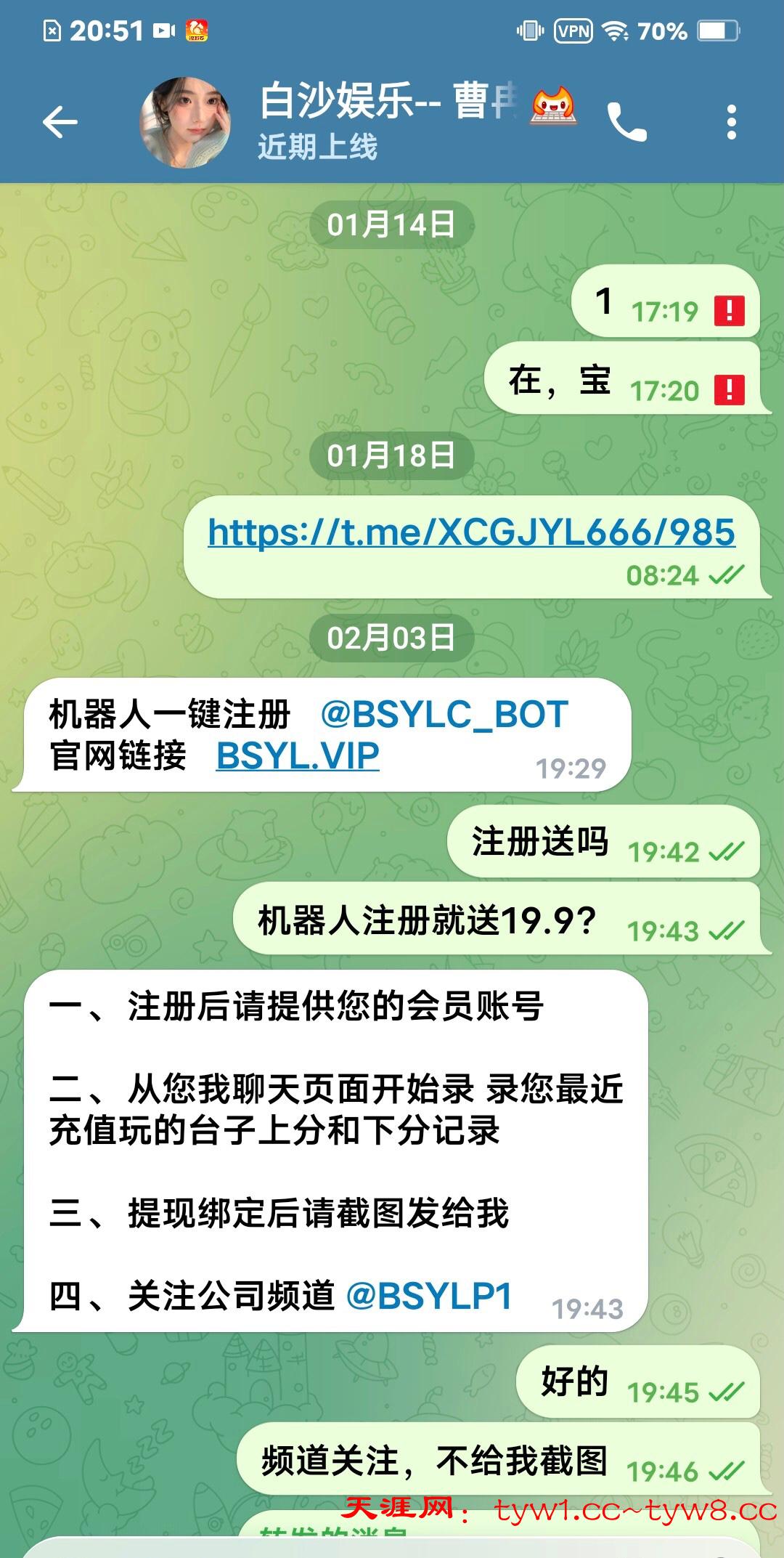 先联系特邀彩金专员飞机号@Bsylcr 给他审核,你注册的账号,地址,绑定的地址必须和提现的地址一致,这个地址必须有提现过,活跃的,我送了,如果不送,这个客服要双向,你可以去他主页找这个网址,先注册,用飞机号,联系在线客服,过几天就会回复你了