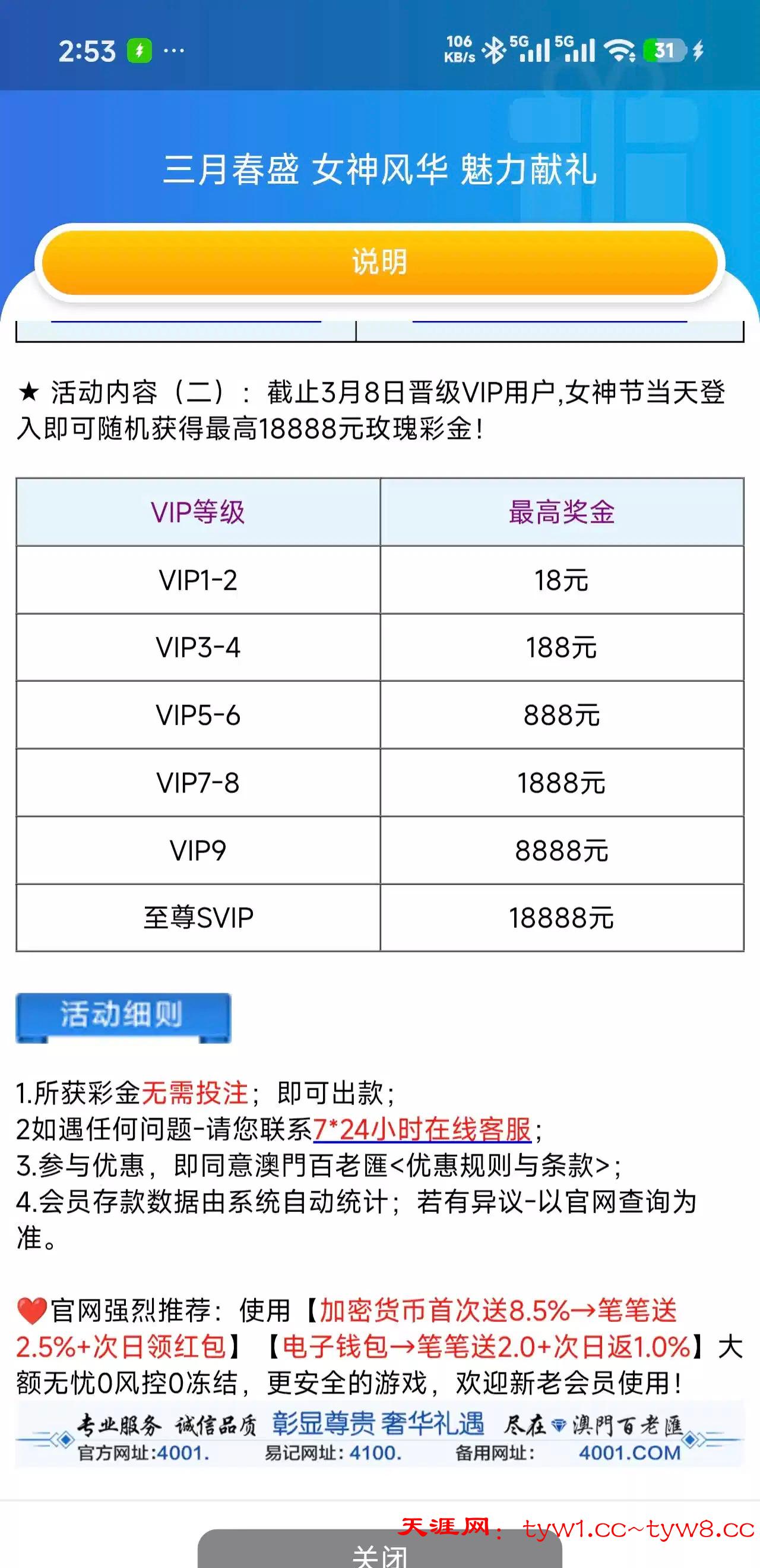 3.8号中午12点登录一下就有 有等级的记得登录一下 我vip3估计保底18 客服说的是随机赠送最高彩金如图