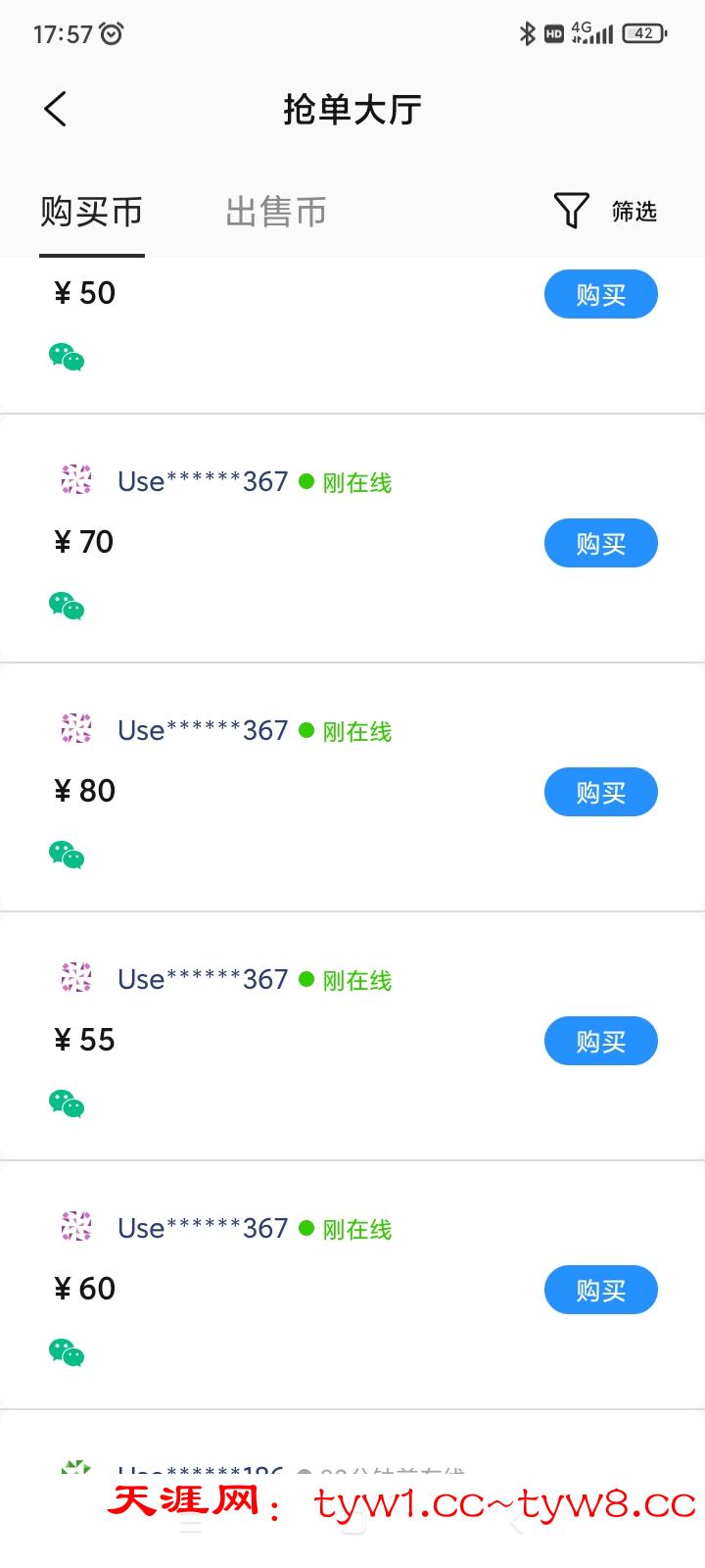 无意中白嫖到的,钱能买币,找下图尾号367的卖家买币,扫她收款码就会进去企业号聊天,客服就告诉我不要买币到她台子玩,注册后送了68,出了108,实际到账107,还介绍了其他网站,昨天送38,今天送48,都白嫖了100多出来,两天白嫖300。各位老哥能嫖到就是福气,不能签到也别骂人