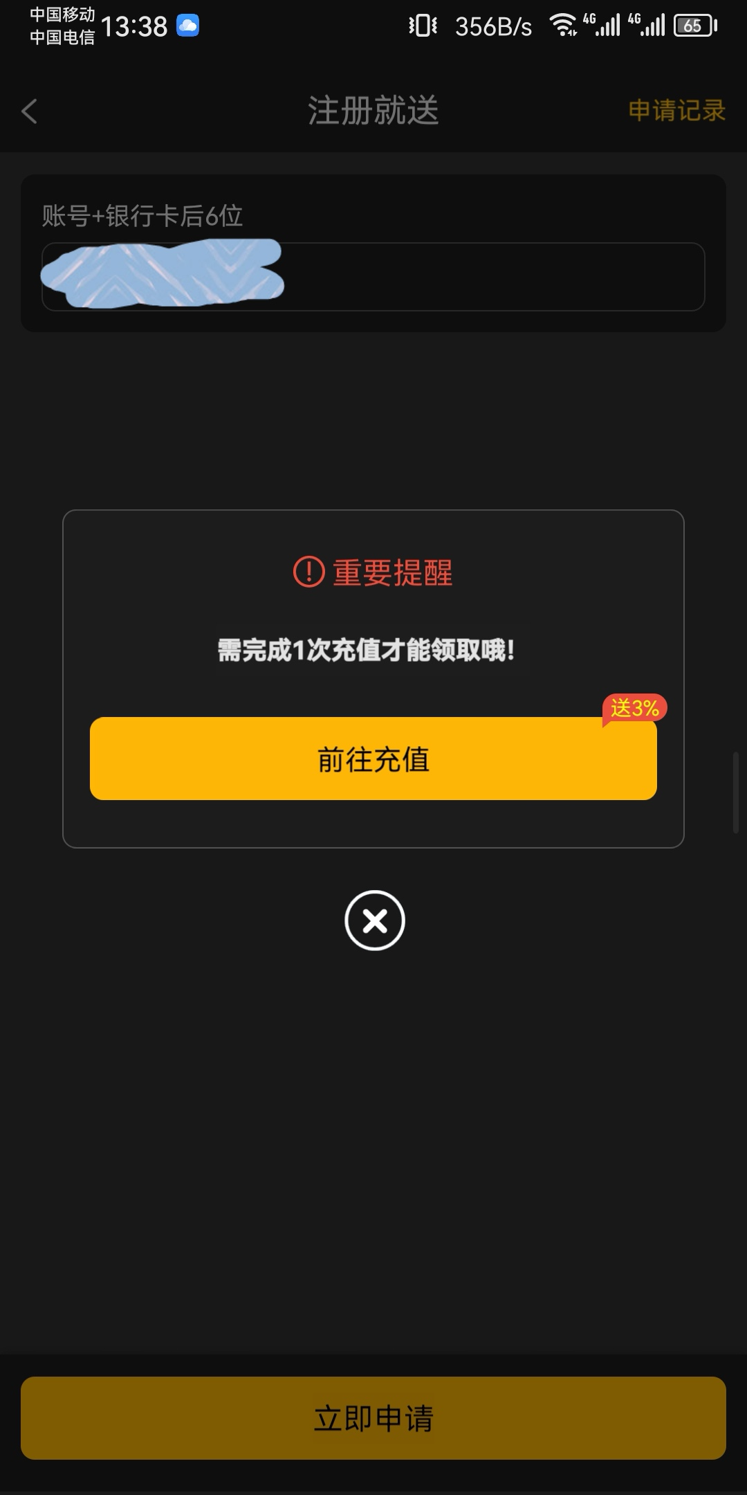 你是代理嘛?还要充值才能申请。