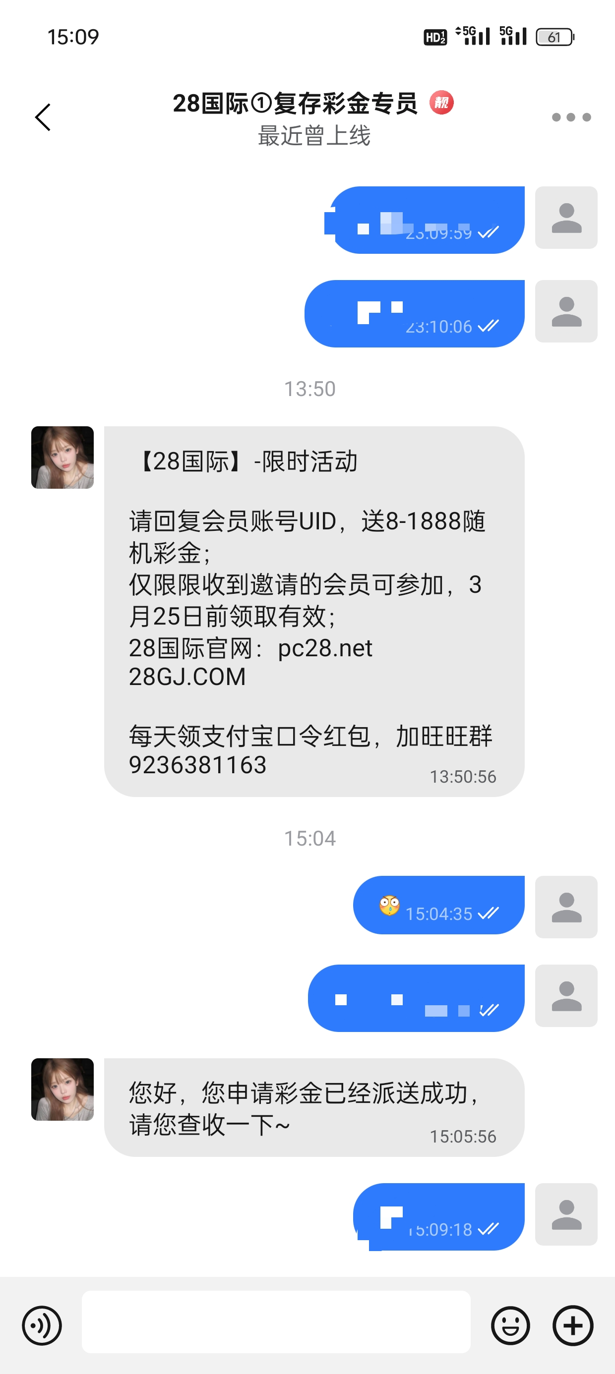 有这个旺旺客服发信息给你发ld就送,我没充值过,送了8.8
