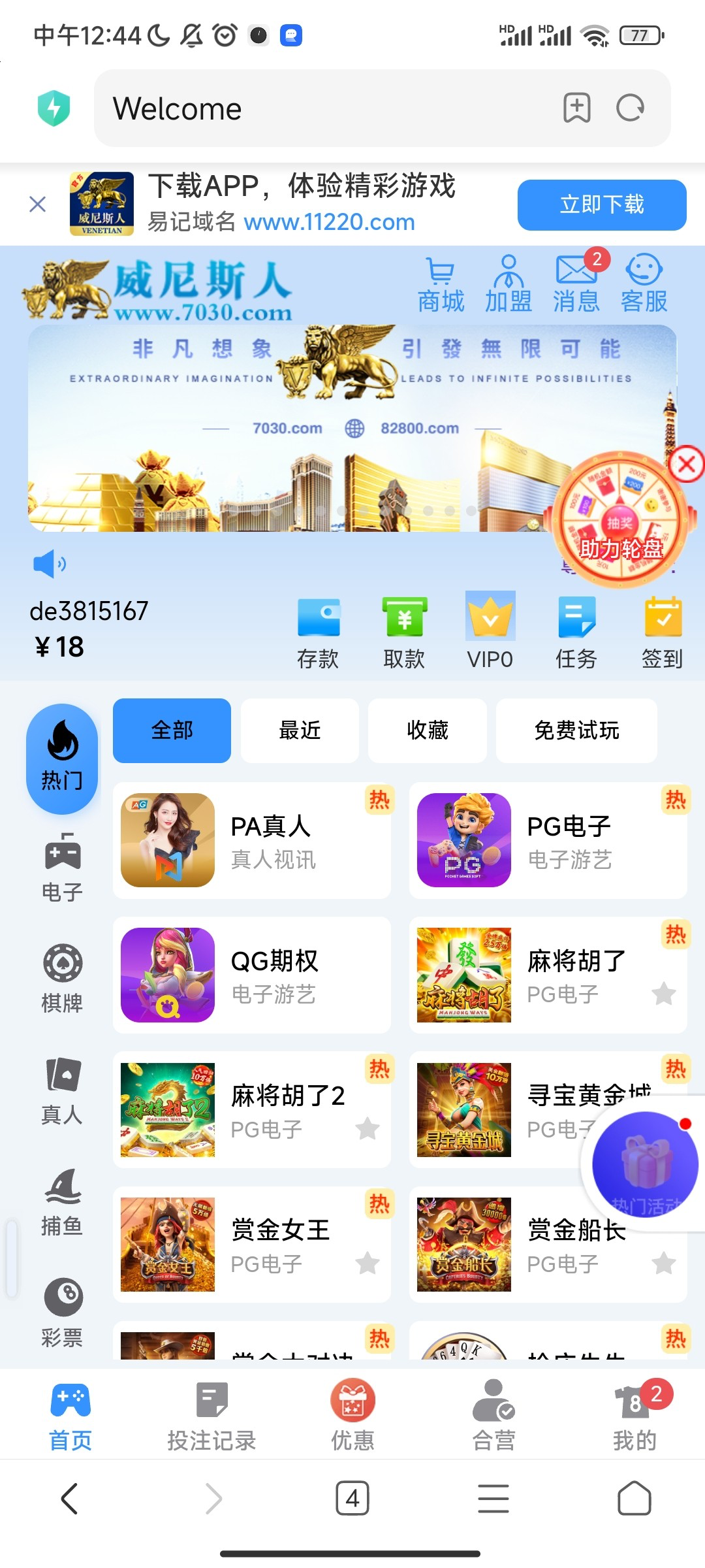 威尼斯人又回馈了,刚才登陆进去就弹红包出来回馈红包,没充值过 www.11220.com