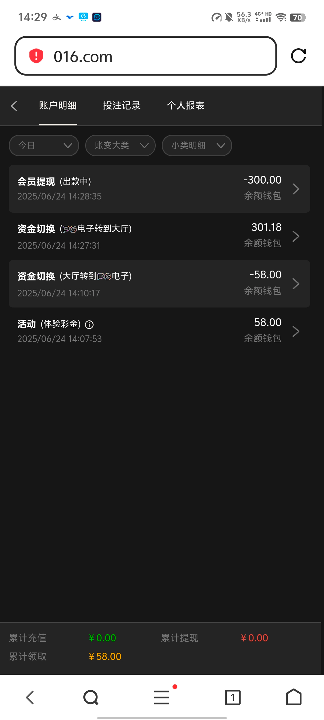 016.com登录上去看看有没有,送了58提了300已经到账