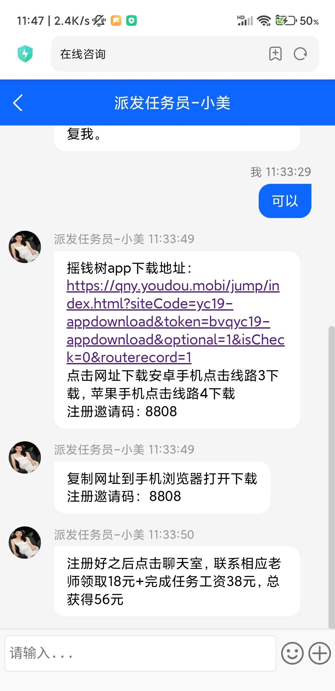 瑶钱树短信邀请的一共送56点链接客服会给你发app 提了一百多到账了地址地址http://hh.hjtzjz.com